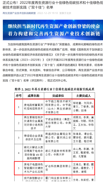 2022年12月29日,再生資源產業技術創新戰略聯盟正式公布了2022年度再生資源行業十佳綠色低碳技術和十佳綠色低碳技術創新實踐(“雙十佳”)名單。經評選認定、公示等程序,中研院牽頭完成的“廢電路板富氧頂吹熔池熔煉技術”、參與完成的“廢電子電器綠色智能循環關鍵技術與產業化應用”共兩項技術榮獲2022年度再生資源行業十佳綠色低碳技術創新實踐成果獎。