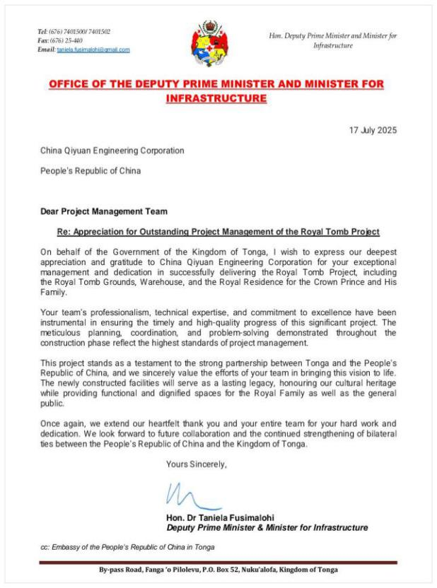 中國(guó)啟源收到來(lái)自湯加政府的感謝信 |