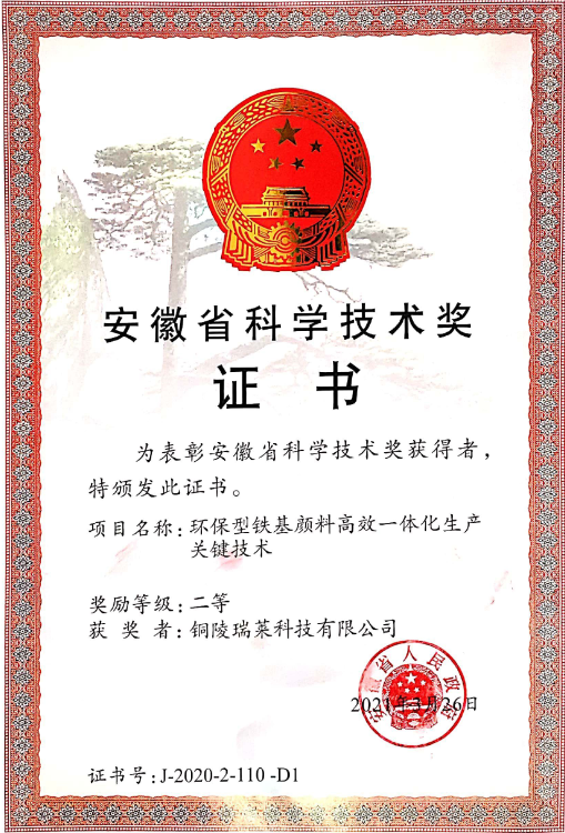 近日,安徽省科技廳發布了2020年安徽省科學技術進步獎獲獎名單,重慶公司所屬的銅陵瑞萊科技有限公司報送的《環保型鐵基顏料高效一體化生產關鍵技術》項目榮獲2020年安徽省科技進步二等獎。