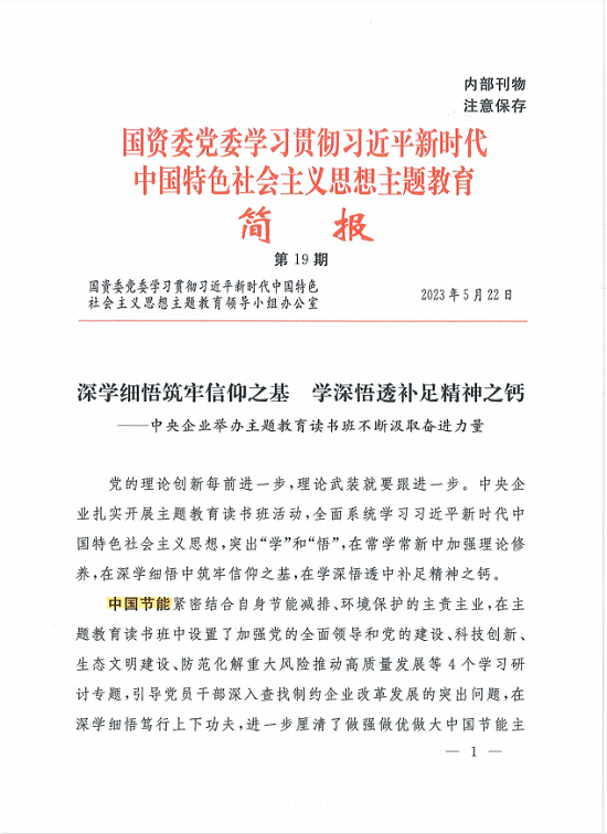 ?近日,中央主題教育官網、國資委網站、“國資小新”新媒體平臺、國資委主題教育簡報多篇次、高頻次報道中國節能開展主題教育的特色亮點和經驗做法,《習近平經濟思想研究》期刊特別刊發中國節能黨委書記、董事長宋鑫有關充分發揮主題教育牽引力作用,推動長江經濟帶高質量發展的署名文章,對中國節能扎實推動主題教育走深走實的具體實踐給予高度評價。