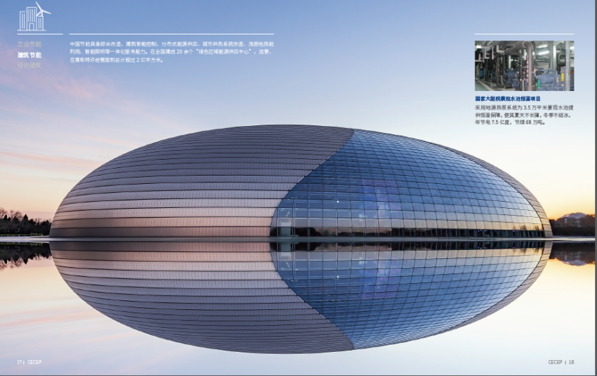 采用地源熱泵系統為3.5萬平方米景觀水池提供恒溫保障,年節電7.5億度,節約標煤68萬噸。